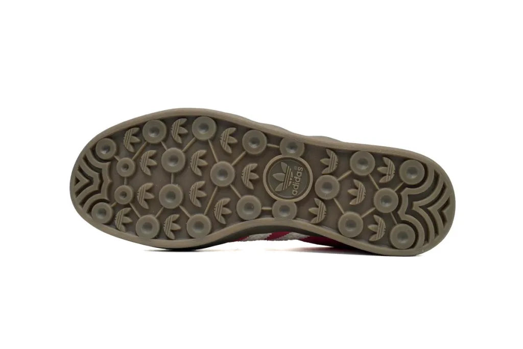 The Ad Gazelle Indoor - Pink/White brings a playful update to the iconic terrace silhouette. Featuring a soft pink suede upper paired with textured off-white serrated Three Stripes and a matching heel tab, this edition stands out with its unique detailing. Gold “GAZELLE” lettering and a solid dark gum sole complete the look, keeping the retro spirit alive with a modern twist.