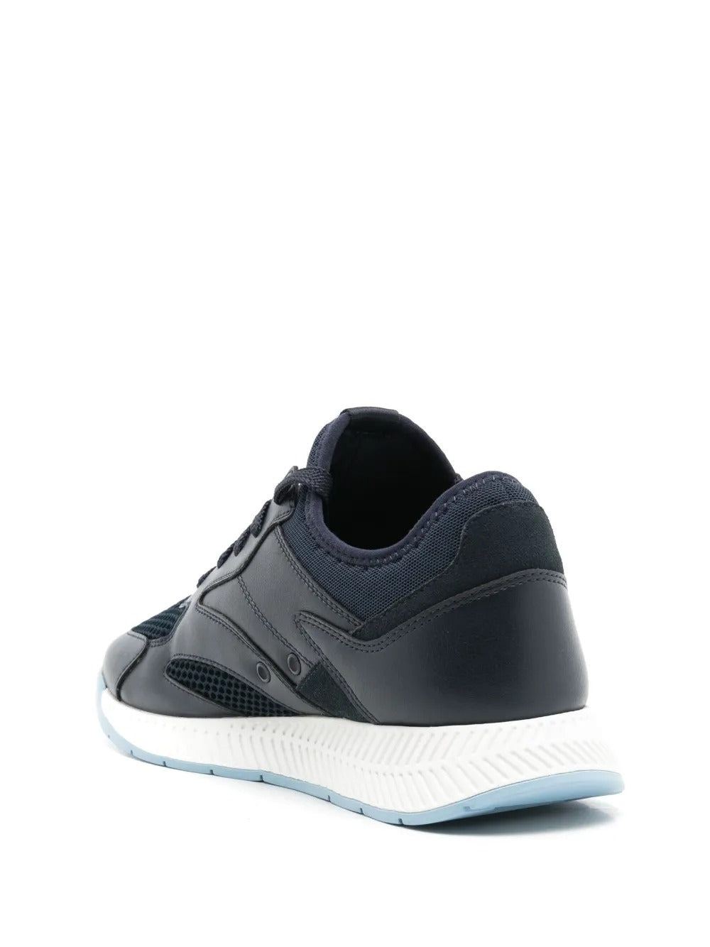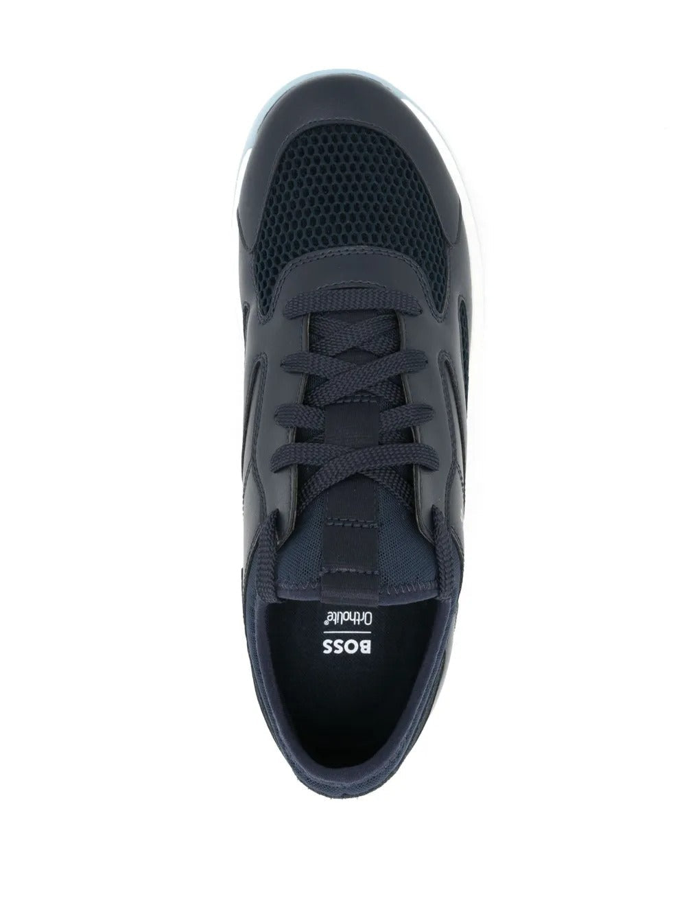 Panelled upper blending smooth surfaces with breathable mesh sections