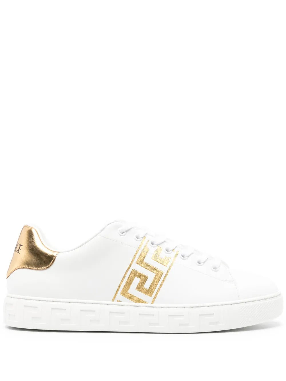 Highlights white/gold-tone calf leather smooth grain signature Greca embroidered motif logo-embroidered tongue front lace-up fastening round toe contrasting branded heel counter branded leather insole flat rubber sole This piece comes complete with a protective dust bag. Composition Outer: Calf Leather 100% Sole: Rubber 100% Lining: Calf Leather 100%