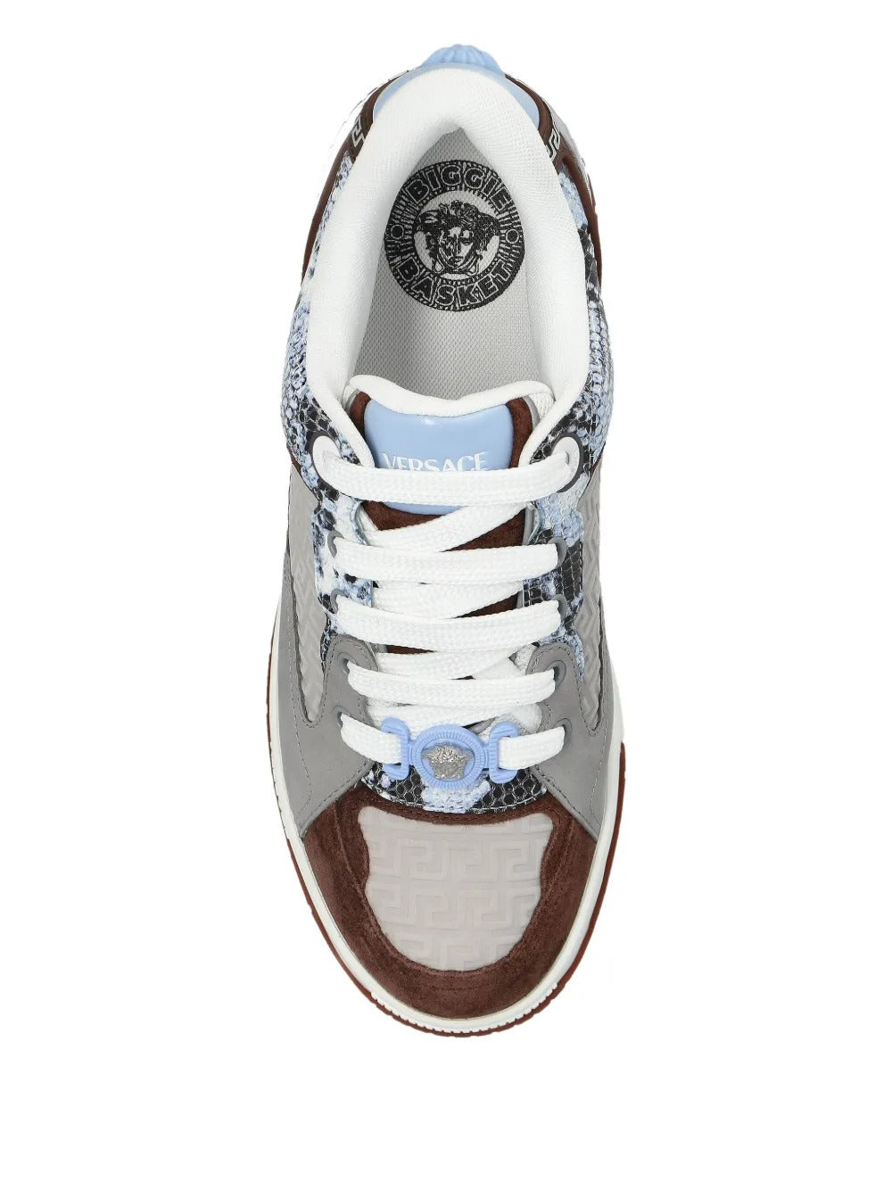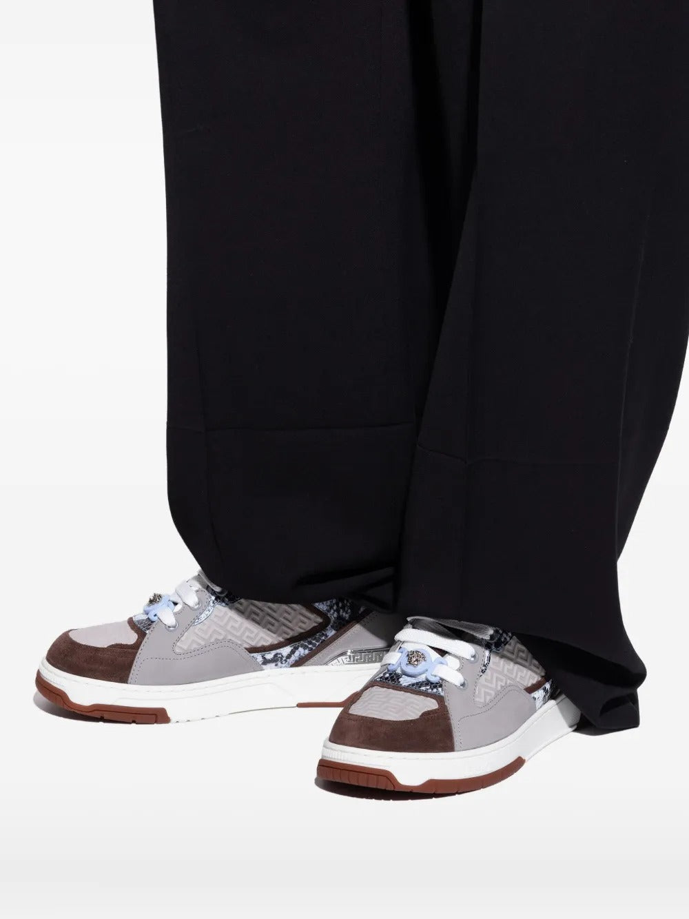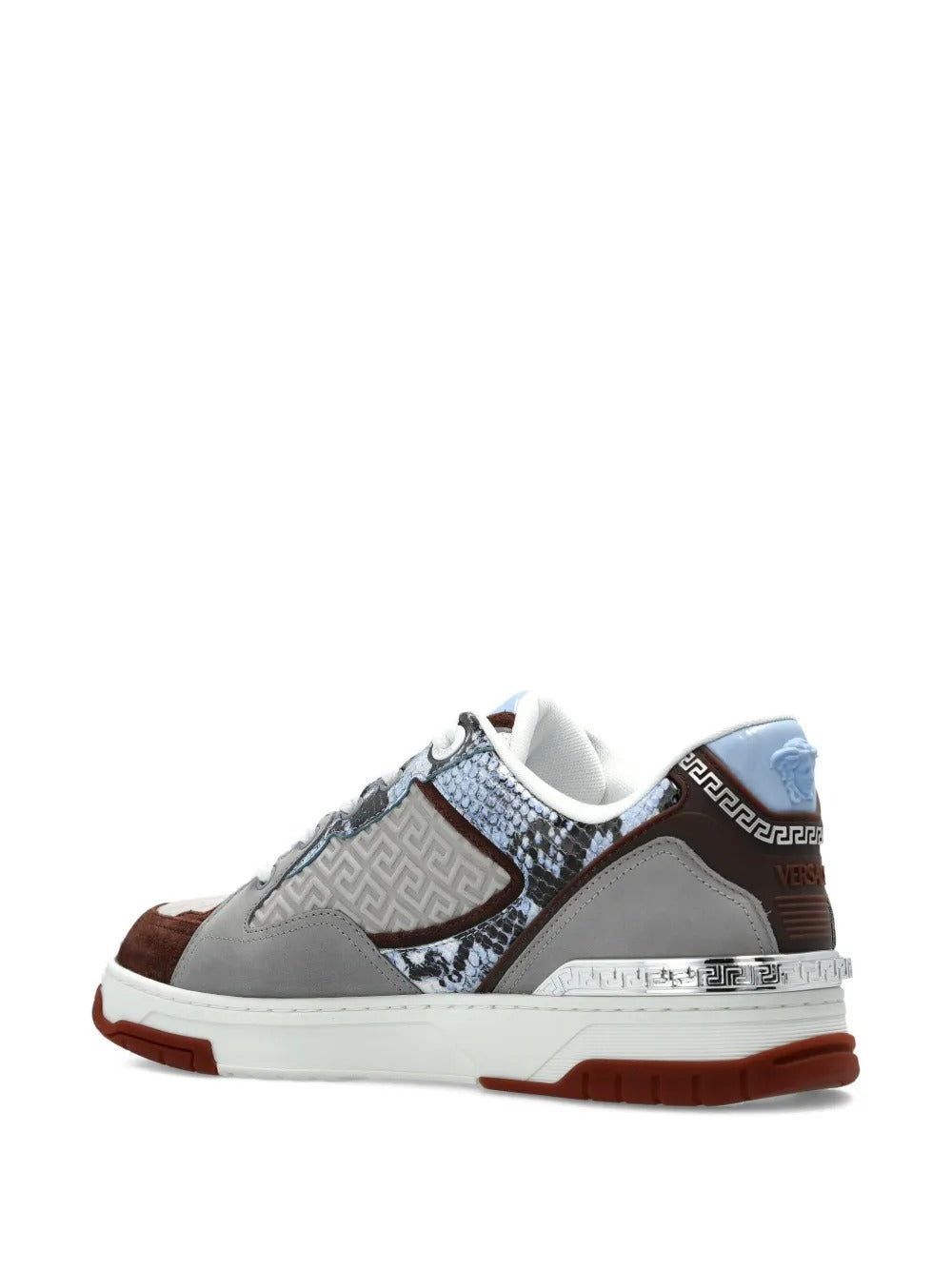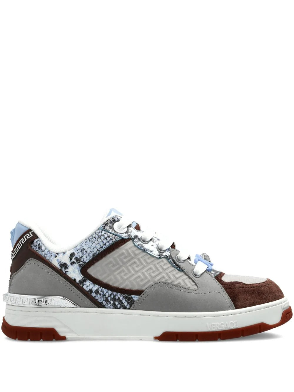 VRS gives the Greca line a bold, textural twist with a refined snakeskin-effect finish applied to smooth calf leather. The pattern adds depth and dimension to the minimalist silhouette, while the iconic Greca motif appears sculpted along the sole, anchoring the sneaker in unmistakable house DNA. A classic lace-up construction keeps the profile clean and versatile, and a rubber sole provides everyday comfort and stability.