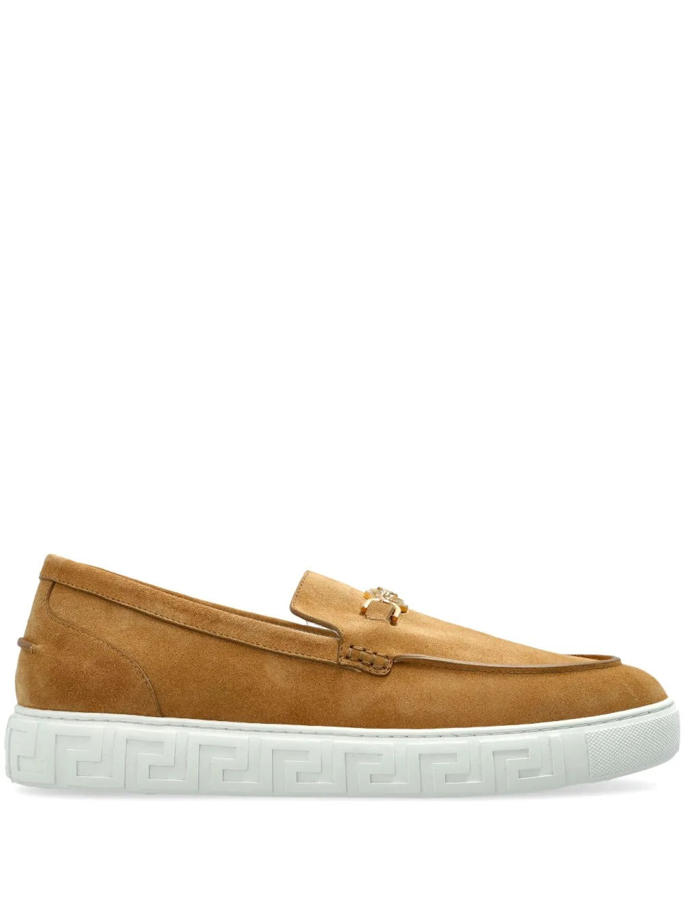 Highlights beige open toe signature Greca detailing rubber sole Composition Sole: Thermoplastic Polyurethane (TPU) 100% Outer: Calf Suede 100% Lining: Calf Leather 100%
